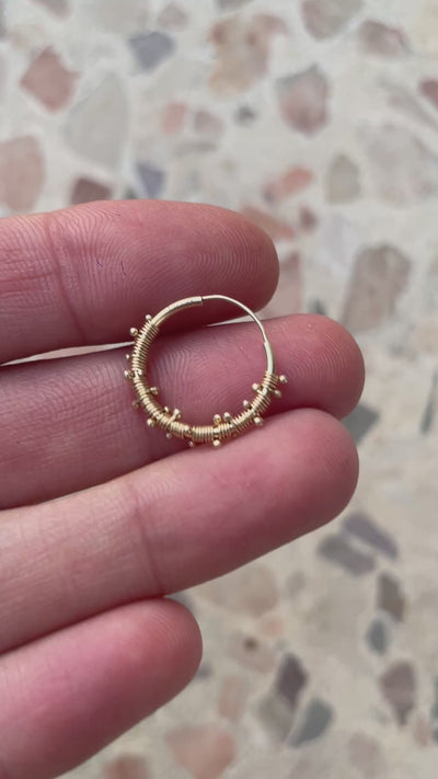 The hoop is partially covered with wrap coiled solid gold wires that each ends with a tiny ball.